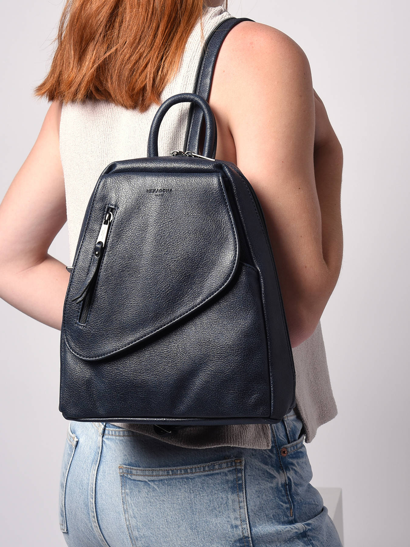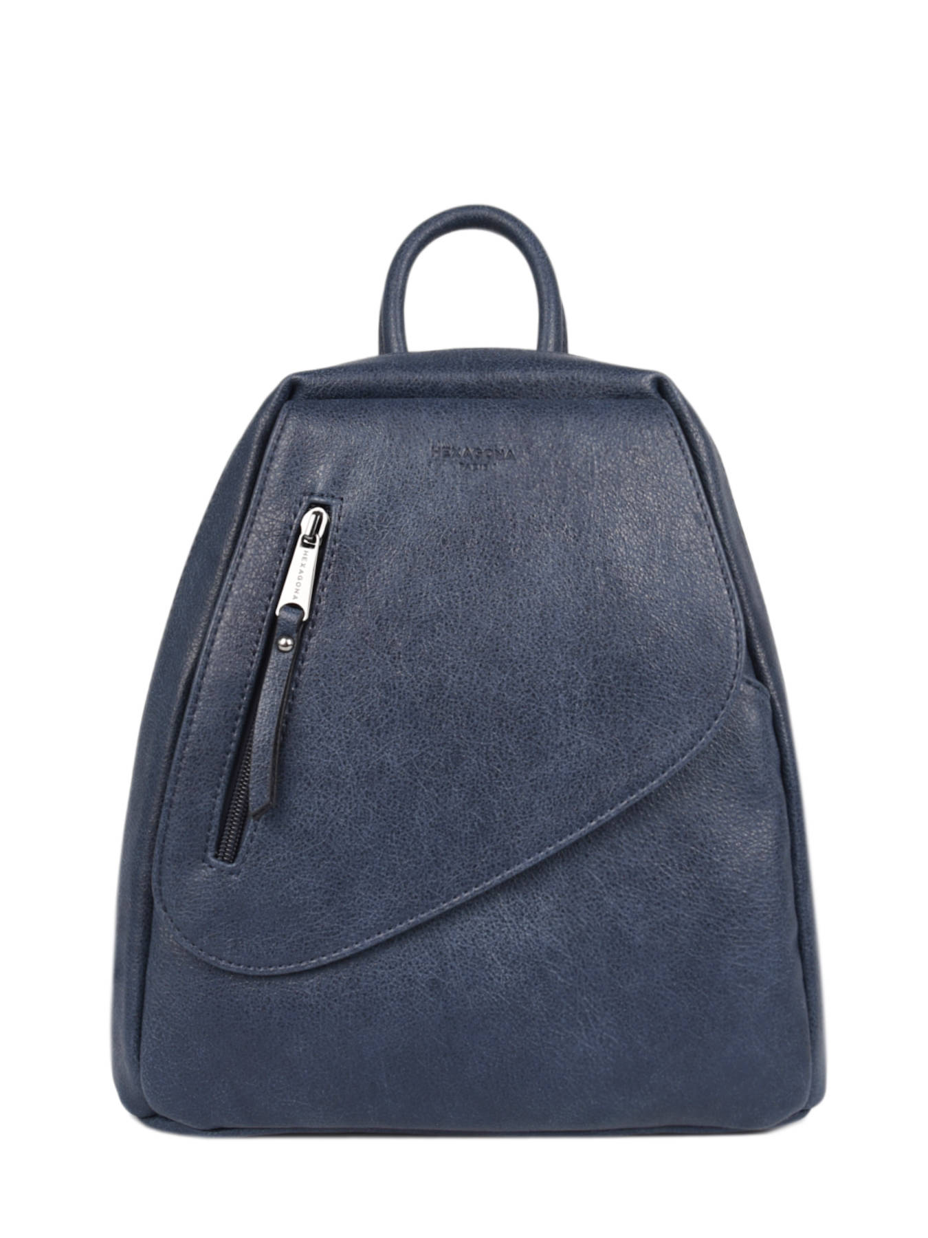 We at Edisac immediately selected this Hexagona backpack from the ""Gracieuse"" line for: its synthetic material and lining, its shiny gunmetal finish and its double zipper closure. Its exterior contains two zipped front pockets (one flat on the magnetic flap) and a flat zipped back pocket. Its interior features a main compartment with a zippered divider pocket, a flat zippered pocket and a phone compartment. This backpack is cell phone compatible, has non-removable adjustable shoulder straps (76 cm mini/96 cm maxi) and a non-removable non-adjustable handle (21,5 cm).