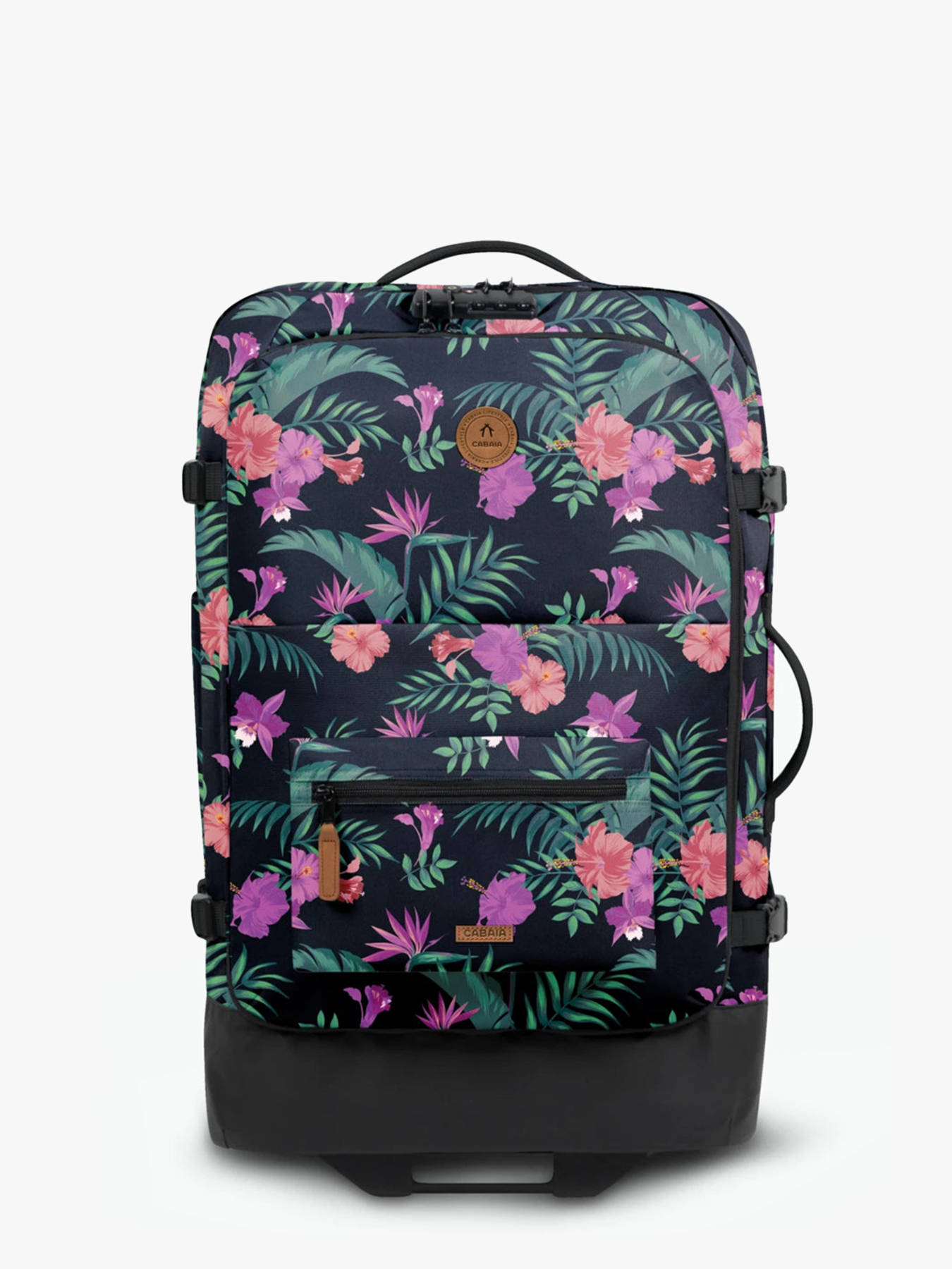 Travel smarter with the Cabaia 2-wheel soft-shell suitcase, built for organized adventurers. Crafted from recycled, vegan, water-repellent materials, it offers both durability and sustainable design. With a generous 75 L capacity, it's ideal for extended trips. Smooth handling is guaranteed thanks to its replaceable wheels, telescopic handle, and side/top carry handles. For added protection, an integrated TSA lock keeps your belongings safe. The exterior features a quick-access front opening, a water bottle pocket, and a MOLLE system to attach modular pouches. A large zipped front pocket adds even more functionality. Inside, you'll find a double compartment layout with compression straps and a laptop sleeve suitable for all sizes. Practical, versatile, and thoughtfully designed, this suitcase is ready to follow you wherever you go—with both comfort and modern style.