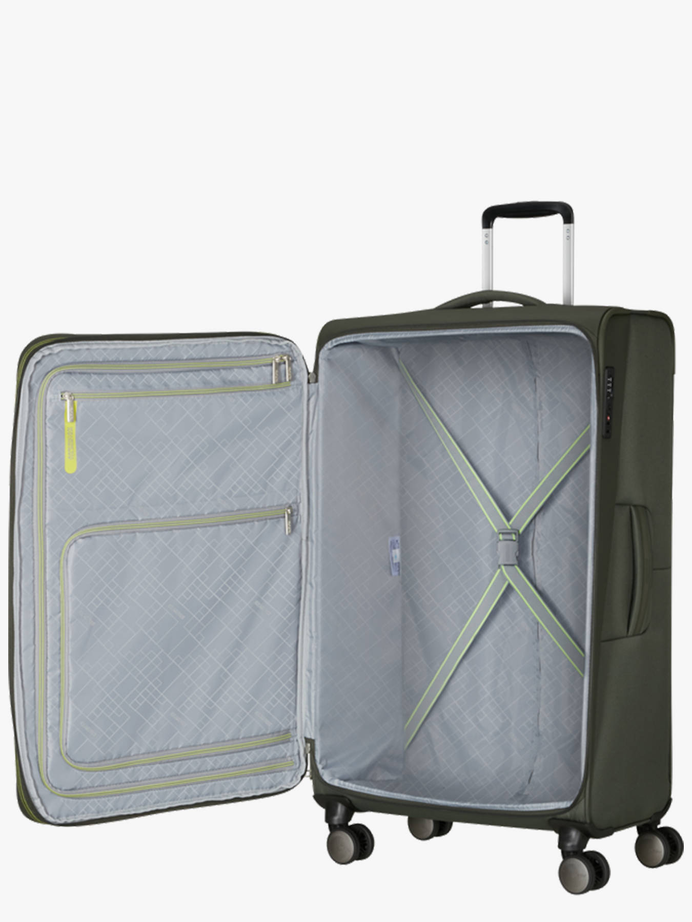 Prepare for extended trips with the AMERICAN TOURISTER WANDERLITE large-capacity soft suitcase. Made from recycled P.E.T, this eco-friendly 3.3 kg suitcase offers an expandable capacity from 108 to 123 L and dimensions of 79 x 48 x 31 cm (expandable to 34 cm), perfect for carrying clothes and accessories securely. Its four XL double wheels provide optimal maneuverability and smooth mobility, while the telescopic handle, top handle, and side handle ensure comfortable transport in all situations. The TSA combination lock protects your belongings, and two front pockets with reflective details add practicality and visibility. Inside, two compartments—including a lower section with straps—and two zippered pockets allow efficient organization of your items. Lightweight, durable, and spacious, this WANDERLITE soft suitcase combines comfort, security, and contemporary style for all your extended travels.